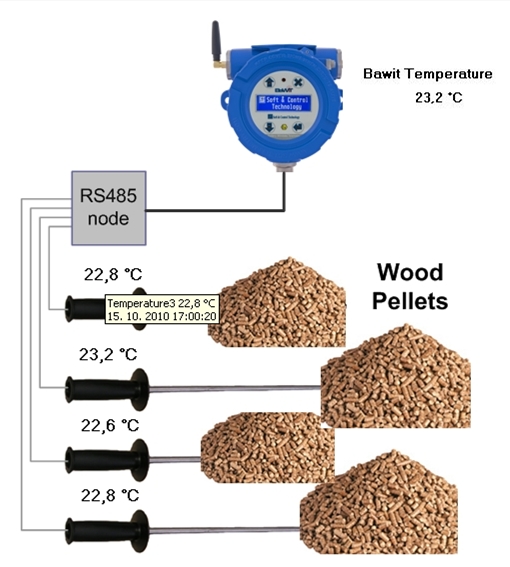 Application consists of one BaWiT –B and four temperature sensors in special version. They are molded into stainless tubes with 14mm diameter and 1,5 m length. The tubes have handles for better manipulation. The handle also serves as cable grommet. This solution offers IP68 protection. Sensors in such design are dedicated for sticking into the pile of wooden pellets.